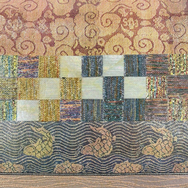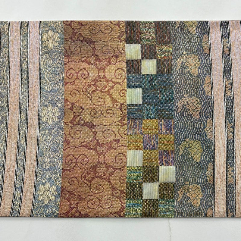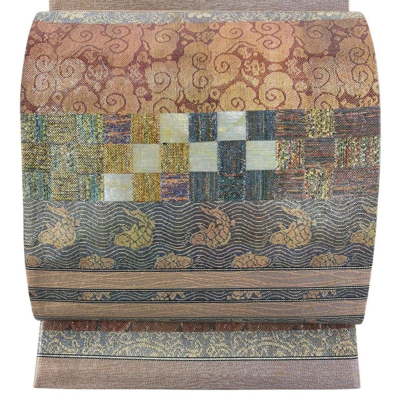 セミフォーマルでお使いいただける袋帯でございます。 見る人に重たい印象を感じさせない女性ならではの、気品豊かな一品です。 締め跡がございます。 お太鼓に薄汚れ、お太鼓柄と前柄に螺鈿箔の若干の変色がございます。 リユース品としては良い状態で、まだまだご活用頂けると思われます。 ※なお、厳しく商品の状態確認を行っておりますが、記載の汚れ以外にも見落とし箇所がある可能性がある旨ご了承いただけますと幸いです。 沢山の商品の中からご覧いただき誠にありがとうございます。