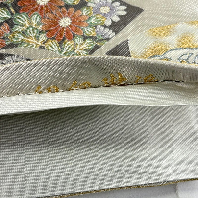セミフォーマルでお使いいただける袋帯でございます。 見る人に重たい印象を感じさせない女性ならではの、気品豊かな一品です。 帯芯が入っておりません。 締め跡がございます。 お太鼓とお太鼓垂先間に小さなシミ、中無地に薄いシミ、中無地に糸つれ、前柄お太鼓間に糸のほつれ、お太鼓付近と手先に糸ゆるみがございます。 リユース品としては目立った染み傷なく、状態の良いお品でございます。 ※なお、厳しく商品の状態確認を行っておりますが、記載の汚れ以外にも見落とし箇所がある可能性がある旨ご了承いただけますと幸いです。 沢山の商品の中からご覧いただき誠にありがとうございます。