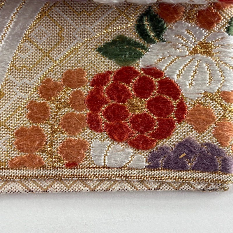 おめでたい席に相応しい意匠の袋帯でございます。 格式高いお席にもお使いいただけますので、お見逃しのないようお願いいたします。 帯芯が入っておりません。 表地所々にシワ、手先に金糸のゆるみ、表地所々に刺繍糸のゆるみがございます。 ※締め跡がお太鼓を含む帯全体にございます。 ※商品の仕立て上、手先と垂先の織り出し口から裏地がはみ出ております。 リユース品としては良い状態で、まだまだご活用頂けると思われます。 ※なお、厳しく商品の状態確認を行っておりますが、記載の汚れ以外にも見落とし箇所がある可能性がある旨ご了承いただけますと幸いです。 沢山の商品の中からご覧いただき誠にありがとうございます。