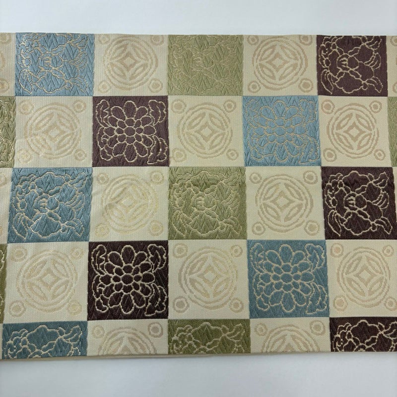 セミフォーマルでお使いいただける袋帯でございます。 見る人に重たい印象を感じさせない女性ならではの、気品豊かな一品です。 締め跡がございます。 中無地締め跡沿いに汚れ、締め跡沿いにシワがございます。 裏地にシミがございます。 リユース品としては良い状態で、まだまだご活用頂けると思われます。 ※なお、厳しく商品の状態確認を行っておりますが、記載の汚れ以外にも見落とし箇所がある可能性がある旨ご了承いただけますと幸いです。 沢山の商品の中からご覧いただき誠にありがとうございます。