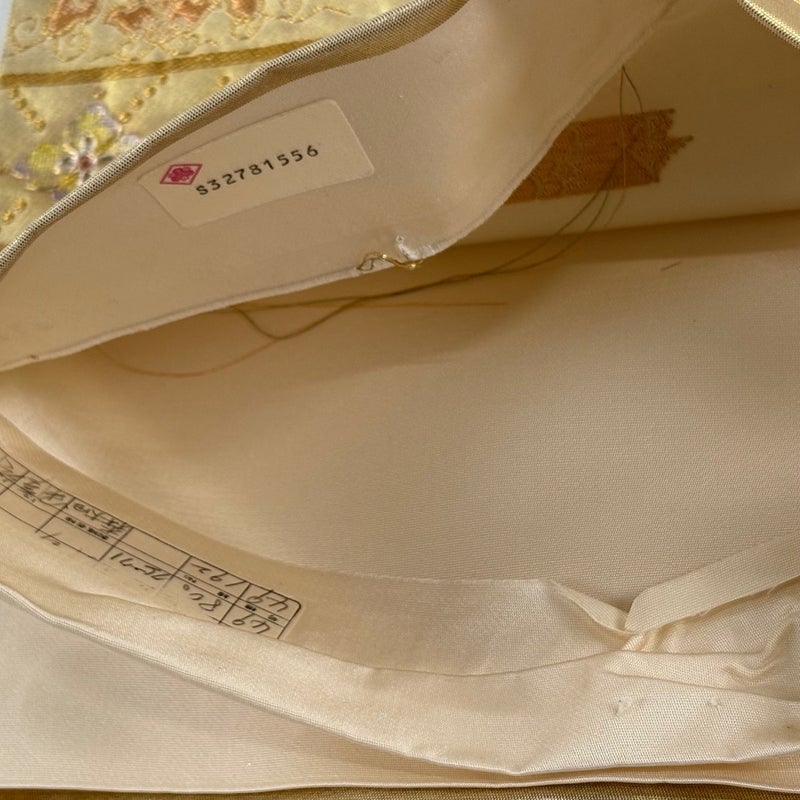 おめでたい席に相応しい意匠のとなみ織物の袋帯でございます。 となみ織物は、嘉永3年、初代礪波宗介が富山県砺波より組紐師として入洛し創業、京都の御用を承りました。 組紐屋から織物へ発展し、いまや西陣において数少ない帯メーカーのひとつです。 格式高いお席にもお使いいただけますので、お見逃しのないようお願いいたします。 帯芯が入っておりません。 前柄に生地の傷み、お太鼓垂先間に小さな下糸の飛び出しがございます。 リユース品としては良い状態で、まだまだご活用頂けると思われます。 ※なお、厳しく商品の状態確認を行っておりますが、記載の汚れ以外にも見落とし箇所がある可能性がある旨ご了承いただけますと幸いです。 沢山の商品の中からご覧いただき誠にありがとうございます。