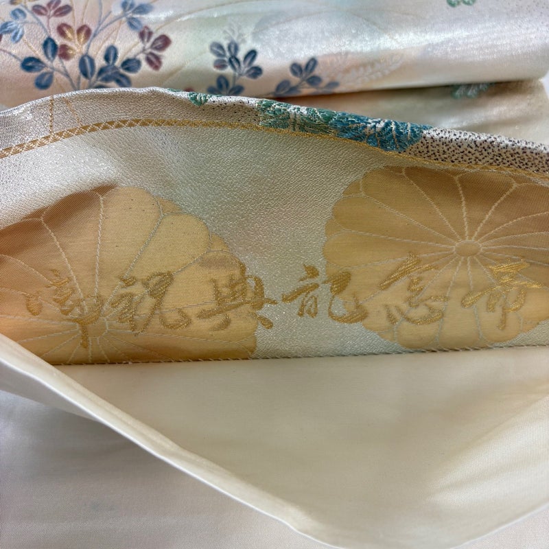 おめでたい席に相応しい意匠の袋帯でございます。 格式高いお席にもお使いいただけますので、お見逃しのないようお願いいたします。 帯芯が入っておりません。 締め跡がございます。 中無地所々にシミ、垂先と中無地と前柄お太鼓間にシワ、表地所々に刺繍糸のゆるみがございます。 リユース品としては良い状態で、まだまだご活用頂けると思われます。 ※なお、厳しく商品の状態確認を行っておりますが、記載の汚れ以外にも見落とし箇所がある可能性がある旨ご了承いただけますと幸いです。 沢山の商品の中からご覧いただき誠にありがとうございます。