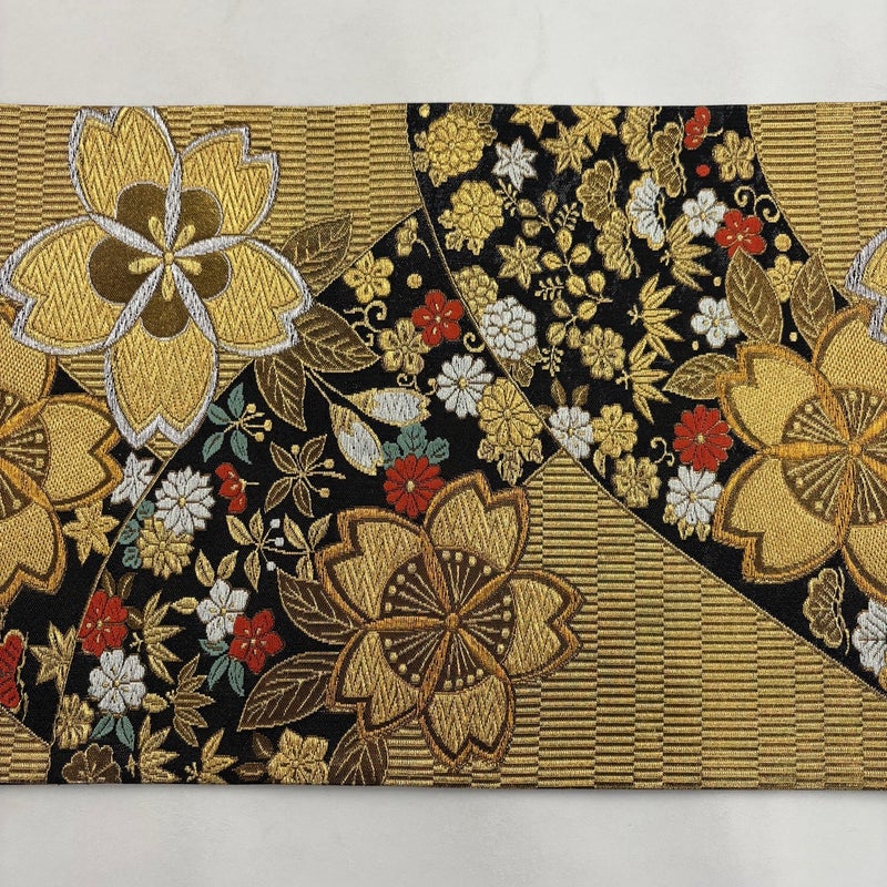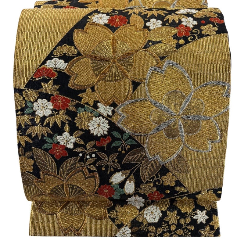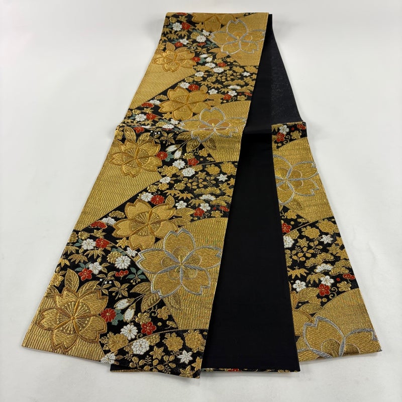 【美品】 袋帯 秀品 桜 松竹梅 金糸 箔 黒 六通 正絹