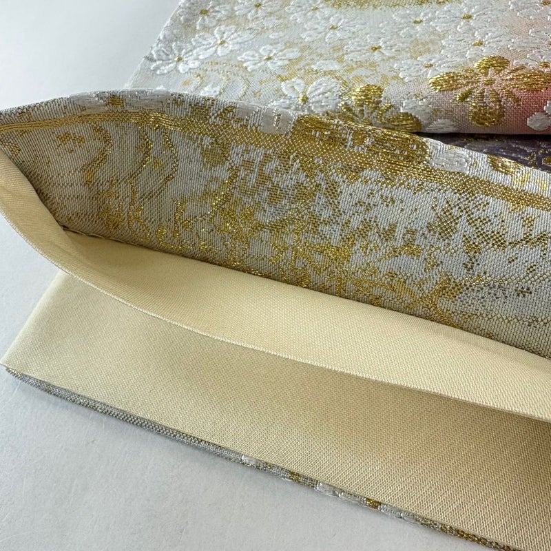 セミフォーマルでお使いいただける袋帯でございます。 見る人に重たい印象を感じさせない女性ならではの、気品豊かな一品です。 締め跡がございます。 前柄とお太鼓垂先間に糸ゆるみがございます。 リユース品としては目立った染み傷なく、状態の良いお品でございます。 ※なお、厳しく商品の状態確認を行っておりますが、記載の汚れ以外にも見落とし箇所がある可能性がある旨ご了承いただけますと幸いです。 沢山の商品の中からご覧いただき誠にありがとうございます。 【PR2】