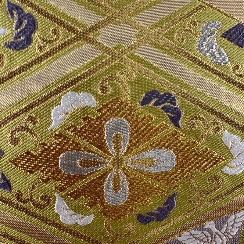 軍配マークと三本線が特徴の「川島織物」謹製の作品です。 おめでたい席に相応しい意匠の袋帯でございます。 格式高いお席にもお使いいただけますので、お見逃しのないようお願いいたします。 締め跡がございます。 前柄お太鼓間に薄いシミ、中無地に汚れがございます。 裏地所々に薄いシミがございます。 リユース品としては良い状態で、まだまだご活用頂けると思われます。 ※なお、厳しく商品の状態確認を行っておりますが、記載の汚れ以外にも見落とし箇所がある可能性がある旨ご了承いただけますと幸いです。 沢山の商品の中からご覧いただき誠にありがとうございます。 【PR2】
