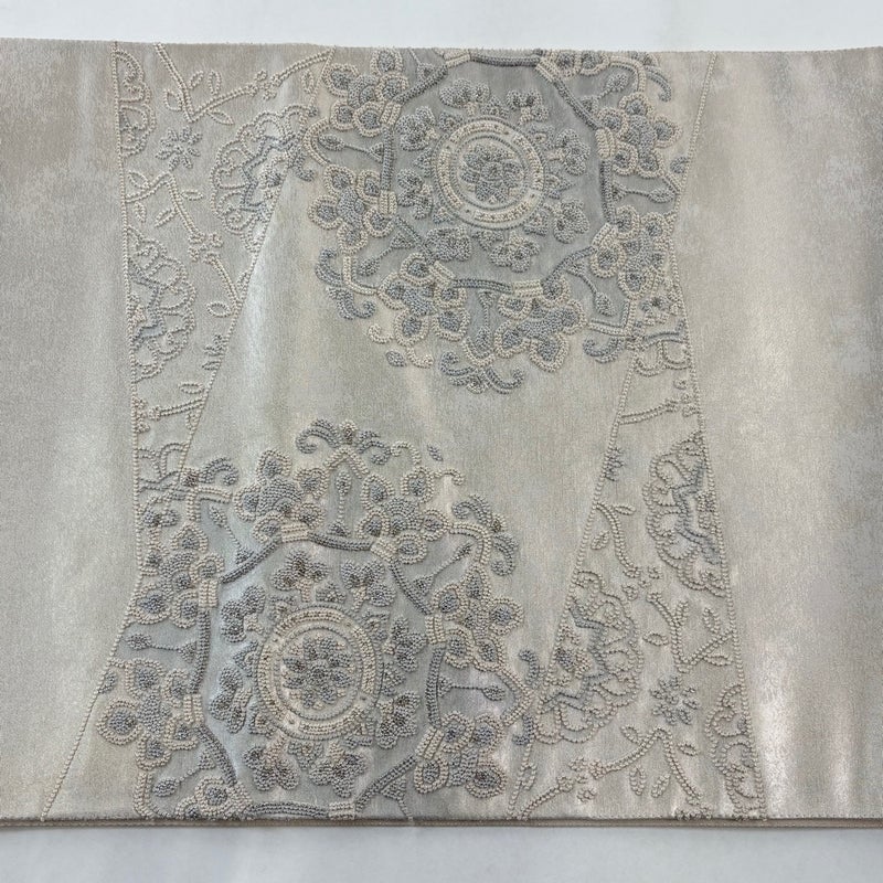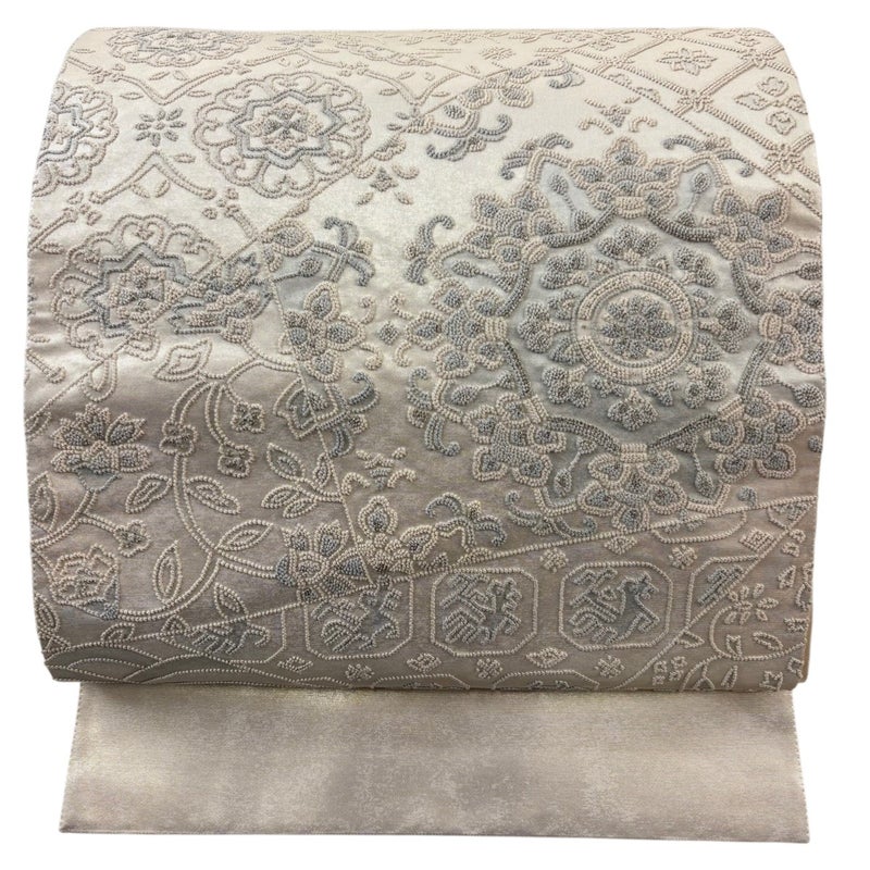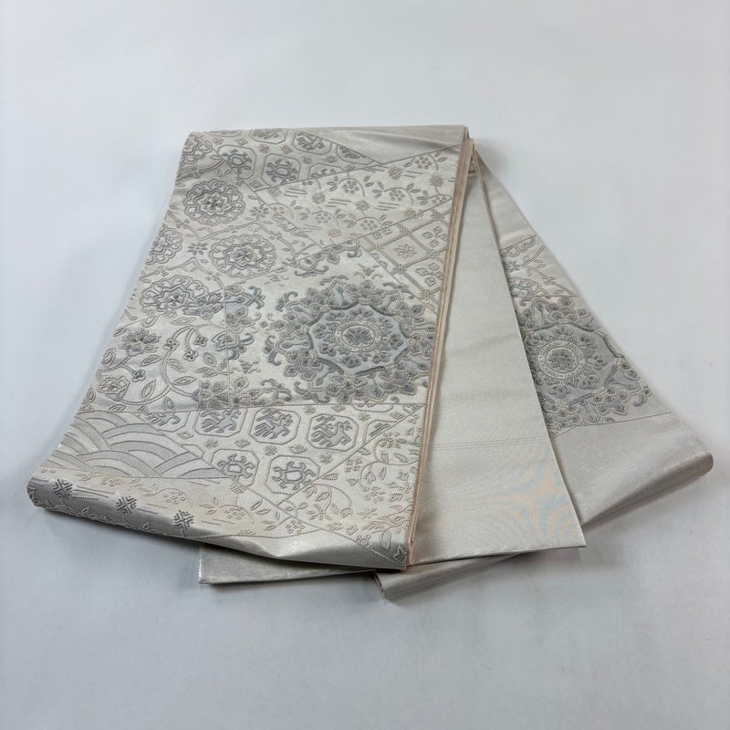 セミフォーマルでお使いいただける袋帯でございます。 見る人に重たい印象を感じさせない女性ならではの、気品豊かな一品です。 締め跡がございます。 表地所々にシワ、手先所々に糸つれ、お太鼓所々と前柄所々に銀糸の変色がございます。 裏地所々にシワがございます。 リユース品としては良い状態で、まだまだご活用頂けると思われます。 ※なお、厳しく商品の状態確認を行っておりますが、記載の汚れ以外にも見落とし箇所がある可能性がある旨ご了承いただけますと幸いです。 沢山の商品の中からご覧いただき誠にありがとうございます。 【PR2】