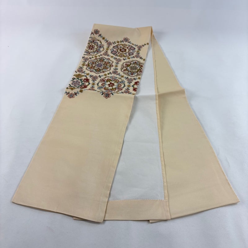 セミフォーマルでお使いいただける袋帯でございます。 見る人に重たい印象を感じさせない女性ならではの、気品豊かな一品です。 締め跡がございます。 手先前柄間に大きなシミがございます。 リユース品としては目立った染み傷なく、状態の良いお品でございます。 ※なお、厳しく商品の状態確認を行っておりますが、記載の汚れ以外にも見落とし箇所がある可能性がある旨ご了承いただけますと幸いです。 沢山の商品の中からご覧いただき誠にありがとうございます。