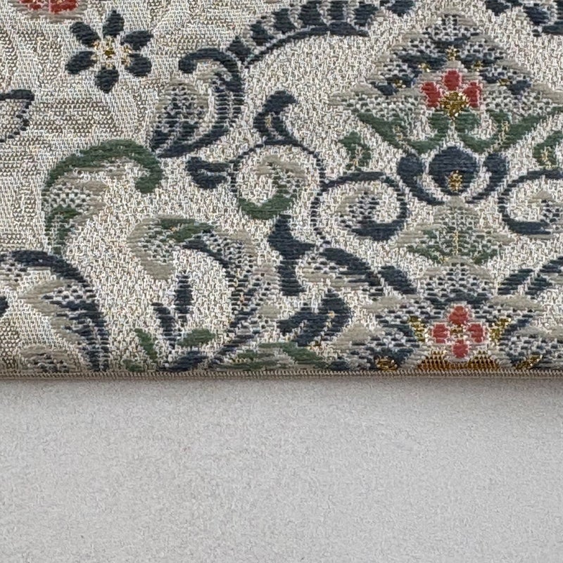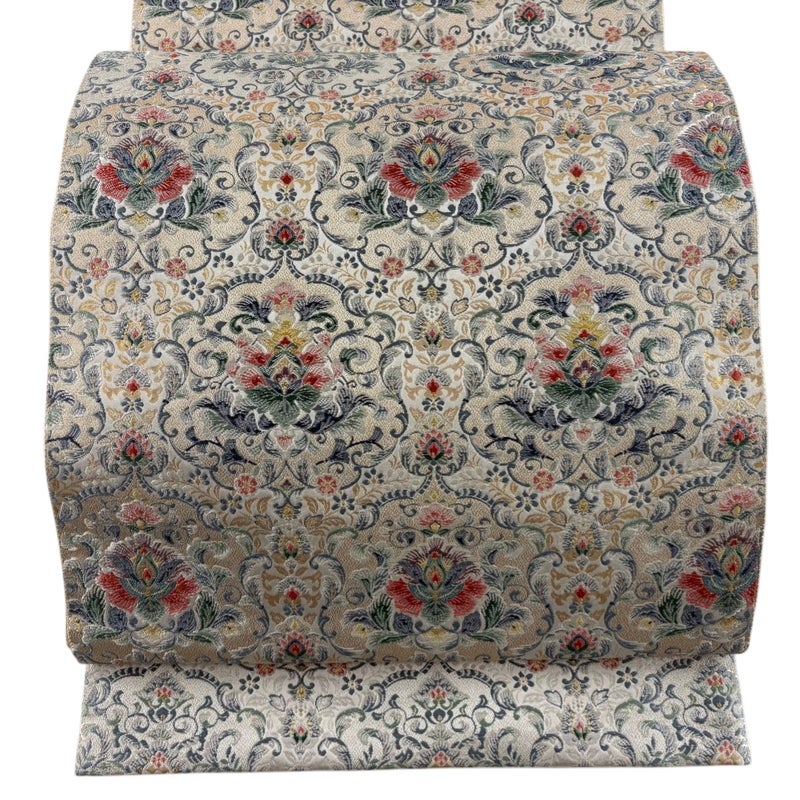 セミフォーマルでお使いいただける袋帯でございます。 見る人に重たい印象を感じさせない女性ならではの、気品豊かな一品です。 帯芯が入っておりません。 ※商品の仕立て上、垂先の織り出し口から少し裏地がはみ出ております。 締め跡がございます。 中無地所々にシミ、中無地締め跡沿いに薄汚れがございます。 リユース品としては良い状態で、まだまだご活用頂けると思われます。 ※なお、厳しく商品の状態確認を行っておりますが、記載の汚れ以外にも見落とし箇所がある可能性がある旨ご了承いただけますと幸いです。 沢山の商品の中からご覧いただき誠にありがとうございます。