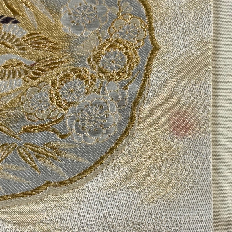 西陣メーカー「加納幸」の作品です。 おめでたい席に相応しい意匠の袋帯でございます。 格式高いお席にもお使いいただけますので、お見逃しのないようお願いいたします。 締め跡がございます。 お太鼓にシミ、中無地締め跡沿いに汚れがございます。 裏地所々にシワがございます。 リユース品としては良い状態で、まだまだご活用頂けると思われます。 ※なお、厳しく商品の状態確認を行っておりますが、記載の汚れ以外にも見落とし箇所がある可能性がある旨ご了承いただけますと幸いです。 沢山の商品の中からご覧いただき誠にありがとうございます。