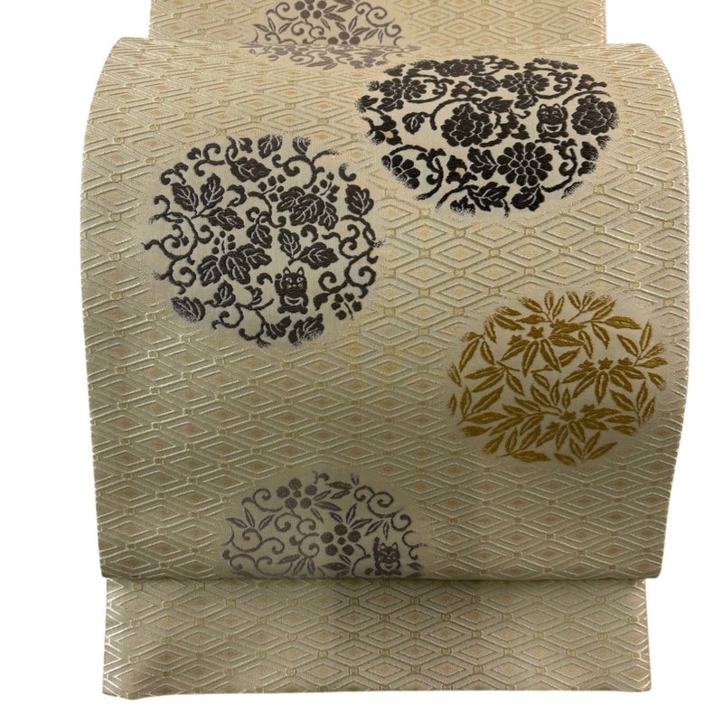 セミフォーマルでお使いいただける袋帯でございます。 見る人に重たい印象を感じさせない女性ならではの、気品豊かな一品です。 リユース品としては目立った染み傷なく、状態の良いお品でございます。 ※なお、厳しく商品の状態確認を行っておりますが、記載の汚れ以外にも見落とし箇所がある可能性がある旨ご了承いただけますと幸いです。 沢山の商品の中からご覧いただき誠にありがとうございます。