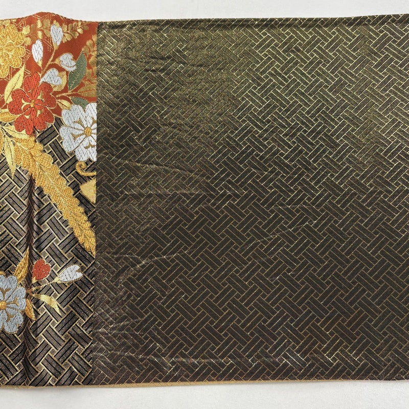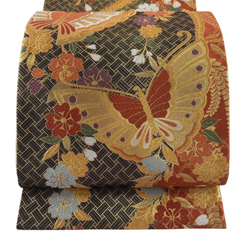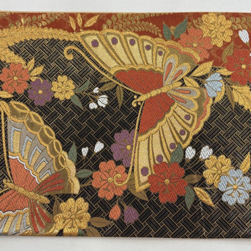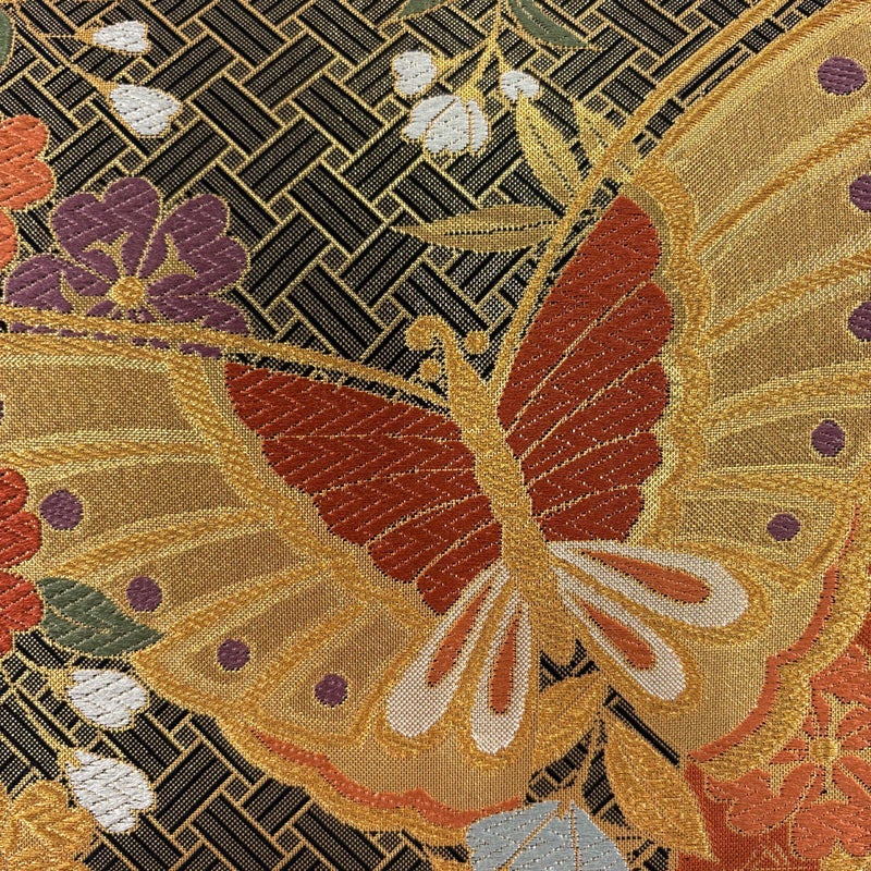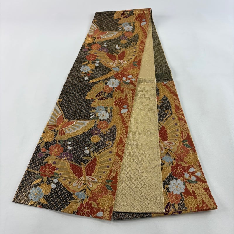 【美品】 袋帯 秀品 振袖向き 蝶 草花 金糸 唐織 金色 六通 正絹