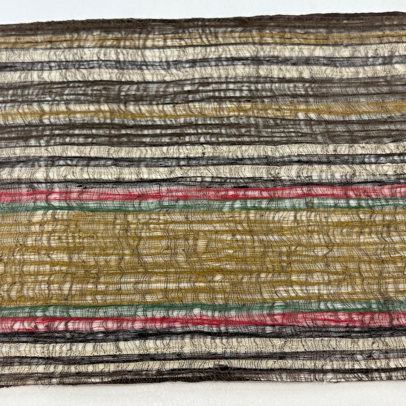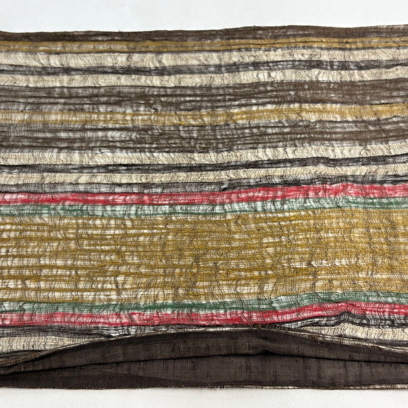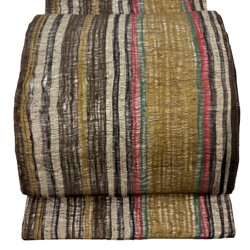 夏帯でございます。 普段使いでお使いいただける袋帯でございます。 カジュアルな装いに合わせてお使いください。 締め跡がございます。 表地所々に生地のヨレ、帯縁等に糸つれがございます。 リユース品としては良い状態で、まだまだご活用頂けると思われます。 ※なお、厳しく商品の状態確認を行っておりますが、記載の汚れ以外にも見落とし箇所がある可能性がある旨ご了承いただけますと幸いです。 沢山の商品の中からご覧いただき誠にありがとうございます。