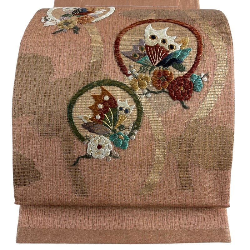 【袋帯】 赤系 ピンクベージュ 秀品 A 帯丈436cm以上 7990-9980 美品 二万以下