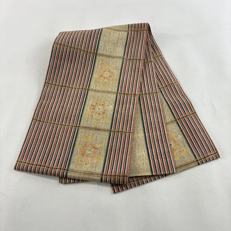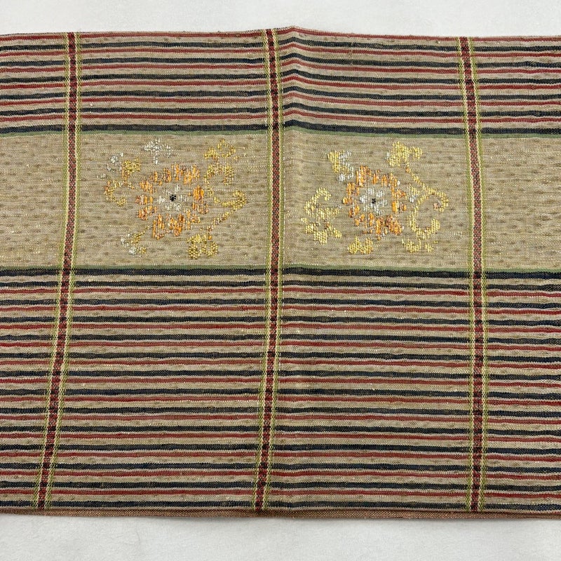 セミフォーマルでお使いいただける袋帯でございます。 見る人に重たい印象を感じさせない女性ならではの、気品豊かな一品です。 帯芯が入っておりません。 締め跡がございます。 表地所々に箔の変色、表地所々に仕立ての歪みがございます。 リユース品としては良い状態で、まだまだご活用頂けると思われます。 ※なお、厳しく商品の状態確認を行っておりますが、記載の汚れ以外にも見落とし箇所がある可能性がある旨ご了承いただけますと幸いです。 沢山の商品の中からご覧いただき誠にありがとうございます。 【PR2】