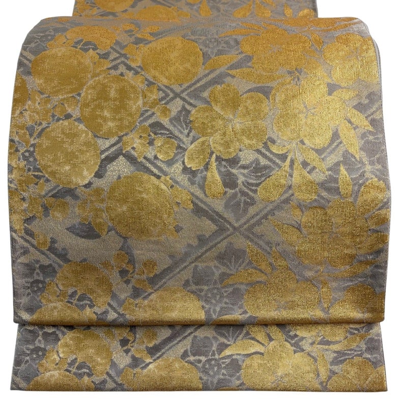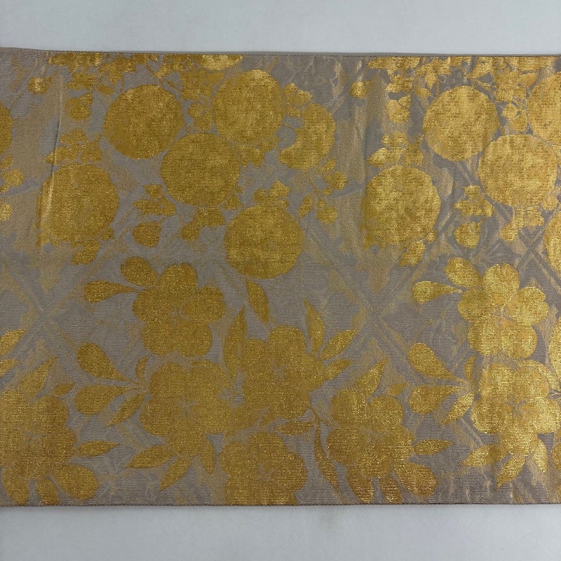 セミフォーマルでお使いいただける袋帯でございます。 見る人に重たい印象を感じさせない女性ならではの、気品豊かな一品です。 帯芯が入っておりません。 締め跡がございます。 締め跡沿いに薄汚れとシワ、手先に生地のヨレがございます。 リユース品としては目立った染み傷なく、状態の良いお品でございます。 ※なお、厳しく商品の状態確認を行っておりますが、記載の汚れ以外にも見落とし箇所がある可能性がある旨ご了承いただけますと幸いです。 沢山の商品の中からご覧いただき誠にありがとうございます。