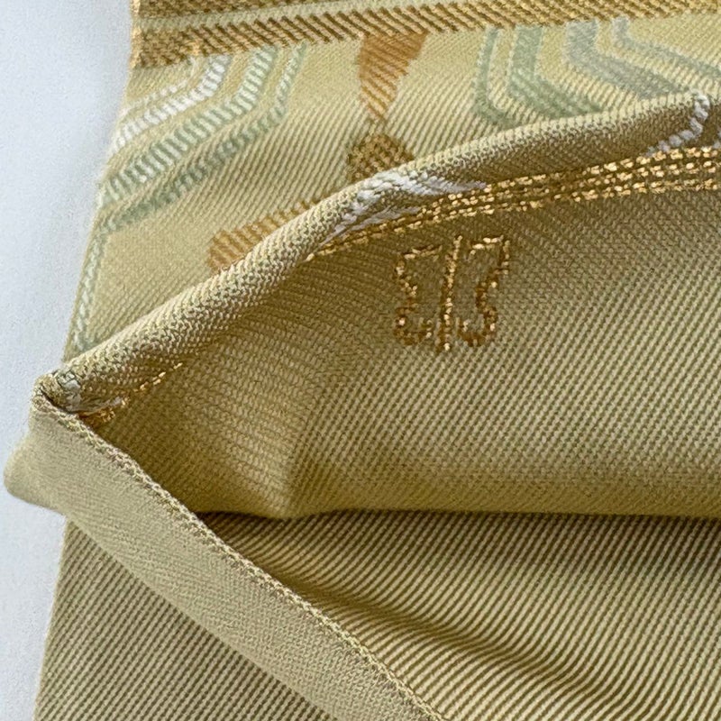 軍配マークと三本線が特徴の「川島織物」謹製の作品です。 おめでたい席に相応しい意匠の袋帯でございます。 格式高いお席にもお使いいただけますので、お見逃しのないようお願いいたします。 帯芯が入っておりません。 締め跡がございます。 中無地所々にシミ、表地所々に薄いシミ、お太鼓垂先間に糸つれがございます。 裏地所々にシミがございます。 リユース品としては良い状態で、まだまだご活用頂けると思われます。 ※なお、厳しく商品の状態確認を行っておりますが、記載の汚れ以外にも見落とし箇所がある可能性がある旨ご了承いただけますと幸いです。 沢山の商品の中からご覧いただき誠にありがとうございます。