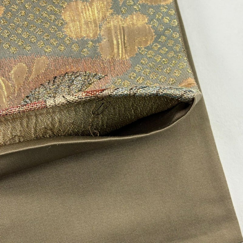 セミフォーマルでお使いいただける袋帯でございます。 見る人に重たい印象を感じさせない女性ならではの、気品豊かな一品です。 帯芯が入っておりません。 締め跡がございます。 裏地の垂先にシミがございます。 リユース品としては目立った染み傷なく、状態の良いお品でございます。 ※なお、厳しく商品の状態確認を行っておりますが、記載の汚れ以外にも見落とし箇所がある可能性がある旨ご了承いただけますと幸いです。 沢山の商品の中からご覧いただき誠にありがとうございます。 ※垂先が開いております。予めご了承くださいませ。