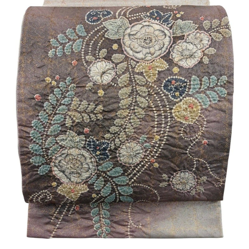 セミフォーマルでお使いいただける袋帯でございます。 見る人に重たい印象を感じさせない女性ならではの、気品豊かな一品です。 締め跡がございます。 リユース品としては目立った染み傷なく、状態の良いお品でございます。 ※なお、厳しく商品の状態確認を行っておりますが、記載の汚れ以外にも見落とし箇所がある可能性がある旨ご了承いただけますと幸いです。 沢山の商品の中からご覧いただき誠にありがとうございます。