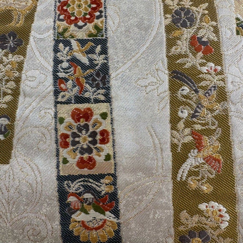 セミフォーマルでお使いいただける袋帯でございます。 見る人に重たい印象を感じさせない女性ならではの、気品豊かな一品です。 締め跡がございます。 中無地にシワがございます。 裏地に薄いシミがございます。 リユース品としては目立った染み傷なく、状態の良いお品でございます。 ※なお、厳しく商品の状態確認を行っておりますが、記載の汚れ以外にも見落とし箇所がある可能性がある旨ご了承いただけますと幸いです。 沢山の商品の中からご覧いただき誠にありがとうございます。
