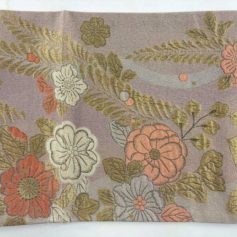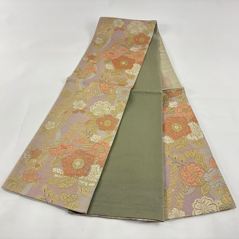 セミフォーマルでお使いいただける袋帯でございます。 見る人に重たい印象を感じさせない女性ならではの、気品豊かな一品です。 締め跡がございます。 中無地に生地のヨレ、お太鼓に薄いシワがございます。 リユース品としては目立った染み傷なく、状態の良いお品でございます。 ※なお、厳しく商品の状態確認を行っておりますが、記載の汚れ以外にも見落とし箇所がある可能性がある旨ご了承いただけますと幸いです。 沢山の商品の中からご覧いただき誠にありがとうございます。