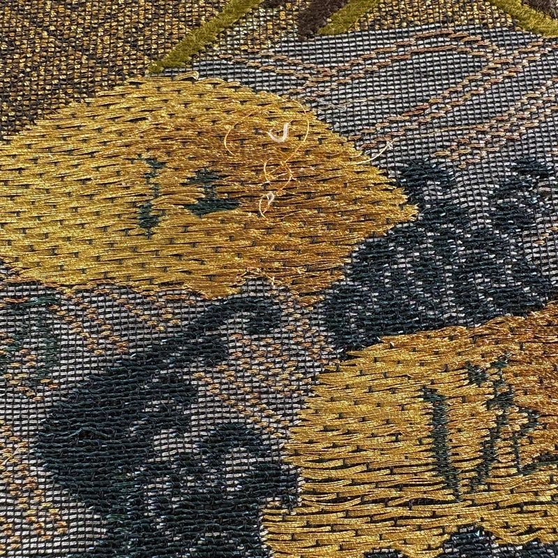セミフォーマルでお使いいただける袋帯でございます。 見る人に重たい印象を感じさせない女性ならではの、気品豊かな一品です。 締め跡がございます。 お太鼓と前柄と手先とお太鼓垂先間などに柄のほつれがございます。 リユース品としては良い状態で、まだまだご活用頂けると思われます。 ※なお、厳しく商品の状態確認を行っておりますが、記載の汚れ以外にも見落とし箇所がある可能性がある旨ご了承いただけますと幸いです。 沢山の商品の中からご覧いただき誠にありがとうございます。