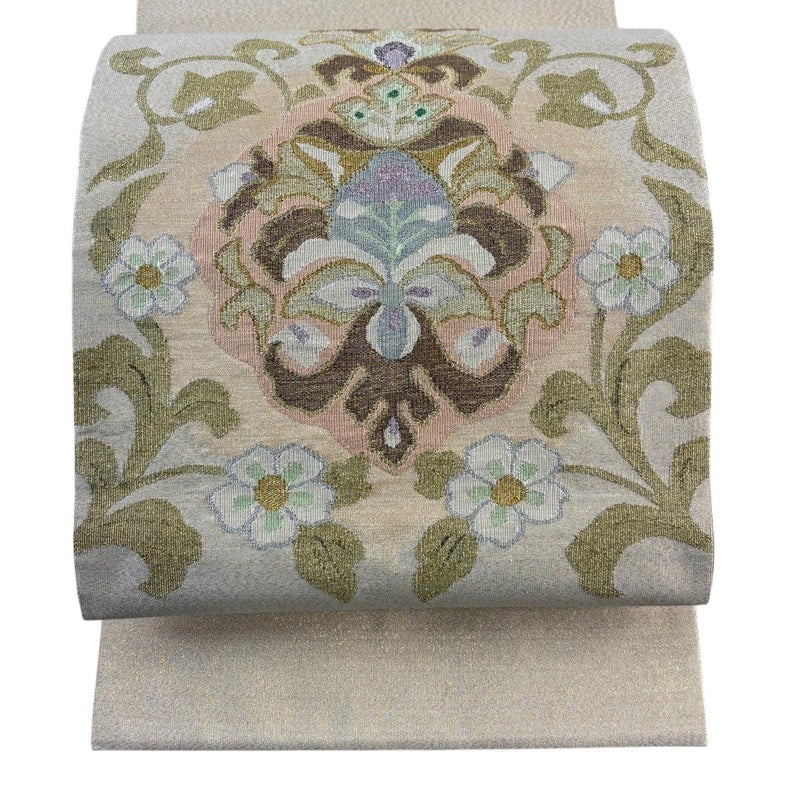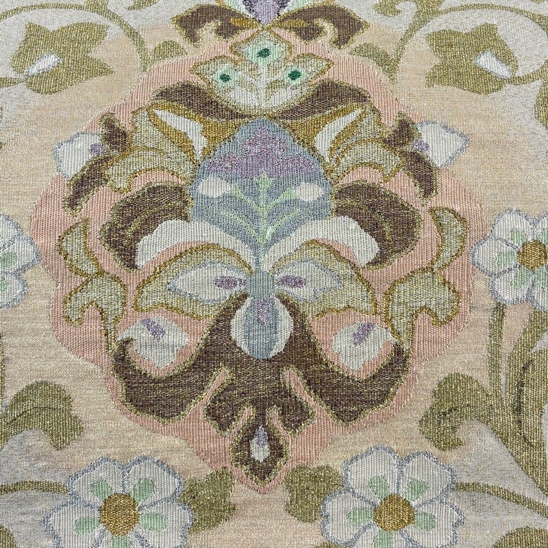 セミフォーマルでお使いいただける袋帯でございます。 見る人に重たい印象を感じさせない女性ならではの、気品豊かな一品です。 締め跡がございます。 リユース品としては目立った染み傷なく、状態の良いお品でございます。 ※なお、厳しく商品の状態確認を行っておりますが、記載の汚れ以外にも見落とし箇所がある可能性がある旨ご了承いただけますと幸いです。 沢山の商品の中からご覧いただき誠にありがとうございます。