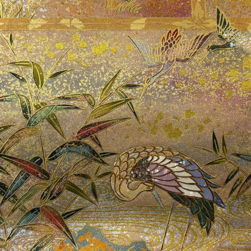 おめでたい席に相応しい意匠の袋帯でございます。 格式高いお席にもお使いいただけますので、お見逃しのないようお願いいたします。 締め跡がございます。 締め跡沿いに汚れ、中無地所々にシミ、表地所々に金銀彩の剥がれや彩変色がございます。 裏地所々にシミがございます。 ご購入の際はその点ご留意ください。 ※なお、厳しく商品の状態確認を行っておりますが、記載の汚れ以外にも見落とし箇所がある可能性がある旨ご了承いただけますと幸いです。 沢山の商品の中からご覧いただき誠にありがとうございます。