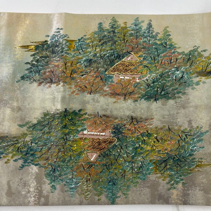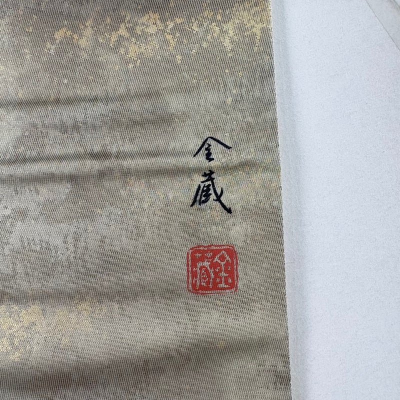 セミフォーマルでお使いいただける袋帯でございます。 見る人に重たい印象を感じさせない女性ならではの、気品豊かな一品です。 締め跡がございます。 手先前柄間にシミ、締め跡沿いに薄汚れ、表地所々にシワがございます。 裏地所々に生地のヨレ、裏地にシミがございます。 リユース品としては目立った染み傷なく、状態の良いお品でございます。 ※なお、厳しく商品の状態確認を行っておりますが、記載の汚れ以外にも見落とし箇所がある可能性がある旨ご了承いただけますと幸いです。 沢山の商品の中からご覧いただき誠にありがとうございます。