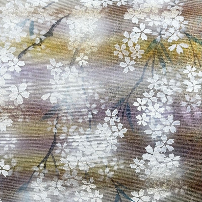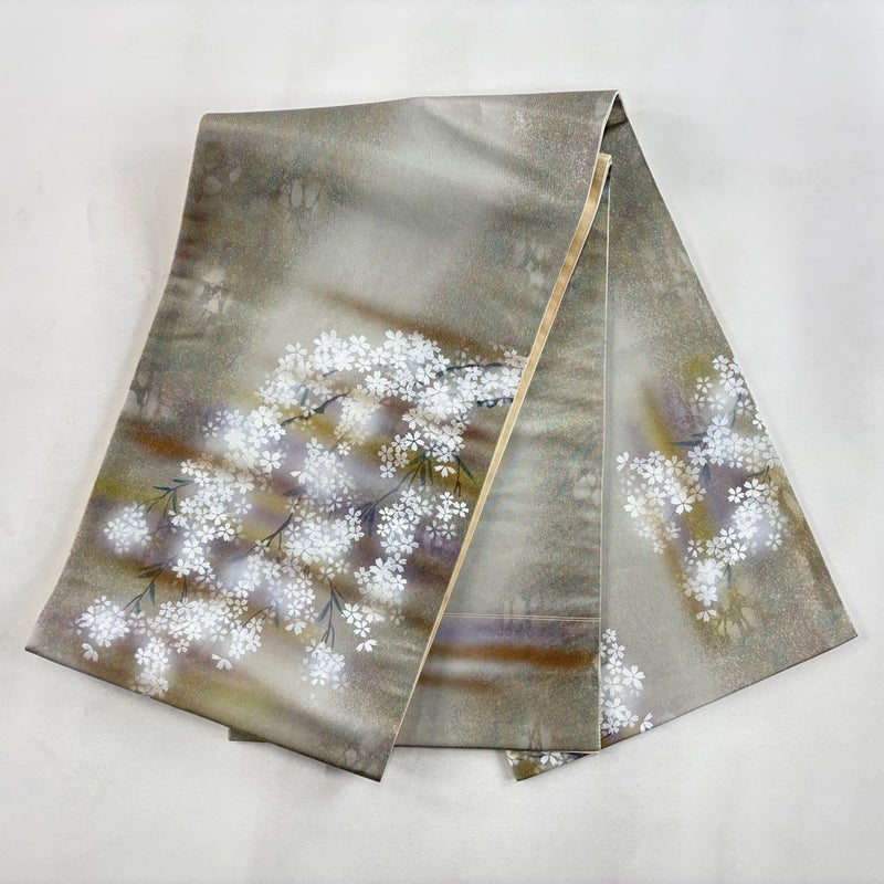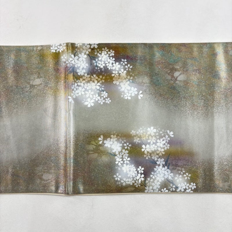 【美品】 袋帯 秀品 落款あり 桜 霞 箔 灰色 お太鼓柄 正絹
