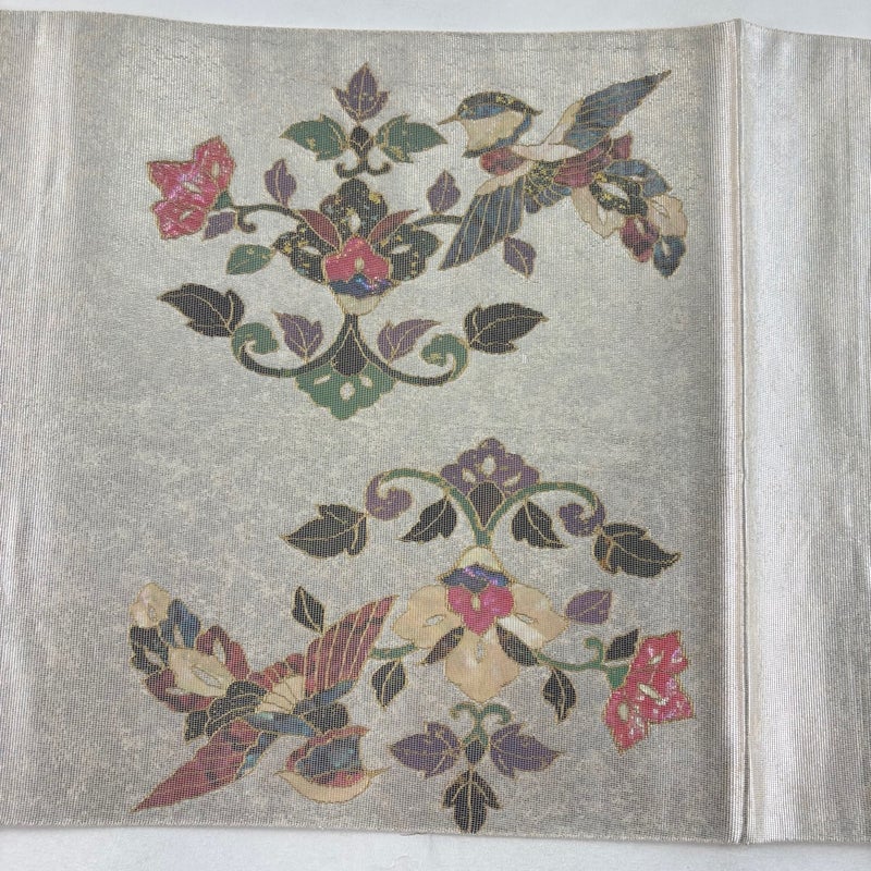 セミフォーマルでお使いいただける袋帯でございます。 見る人に重たい印象を感じさせない女性ならではの、気品豊かな一品です。 帯芯が入っておりません。 締め跡がございます。 手先前柄間にシミ、お太鼓垂先間と前柄お太鼓間にシワがございます。 リユース品としては目立った染み傷なく、状態の良いお品でございます。 ※なお、厳しく商品の状態確認を行っておりますが、記載の汚れ以外にも見落とし箇所がある可能性がある旨ご了承いただけますと幸いです。 沢山の商品の中からご覧いただき誠にありがとうございます。 【PR2】