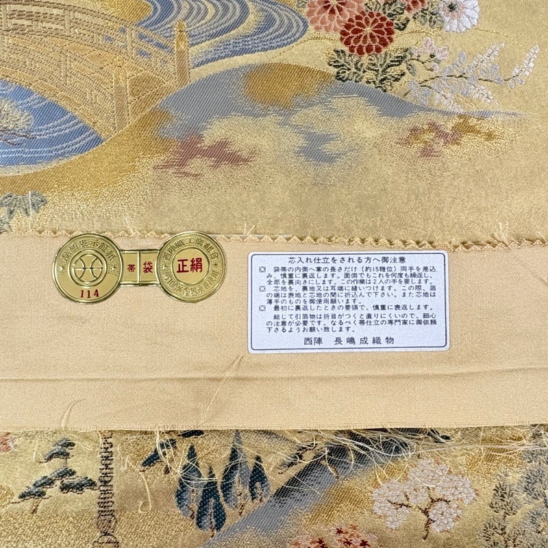 昭和23年に創業した西陣の老舗、「長嶋成織物」の作品です。 おめでたい席に相応しい意匠の袋帯でございます。 格式高いお席にもお使いいただけますので、お見逃しのないようお願いいたします。 締め跡がございます。 手先前柄間の締め跡沿いに薄汚れや若干の箔の傷みがございます。 リユース品としては目立った染み傷なく、状態の良いお品でございます。 ※なお、厳しく商品の状態確認を行っておりますが、記載の汚れ以外にも見落とし箇所がある可能性がある旨ご了承いただけますと幸いです。 沢山の商品の中からご覧いただき誠にありがとうございます。 【PR2】