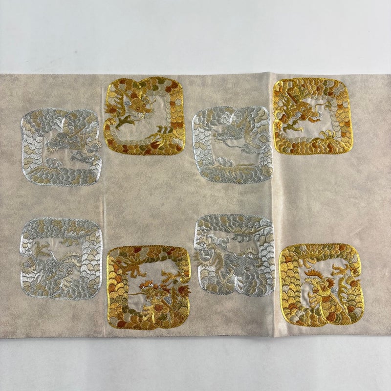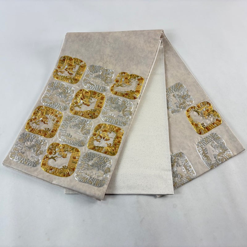 セミフォーマルでお使いいただける袋帯でございます。 見る人に重たい印象を感じさせない女性ならではの、気品豊かな一品です。 締め跡がございます。 リユース品としては目立った染み傷なく、状態の良いお品でございます。 ※なお、厳しく商品の状態確認を行っておりますが、記載の汚れ以外にも見落とし箇所がある可能性がある旨ご了承いただけますと幸いです。 沢山の商品の中からご覧いただき誠にありがとうございます。