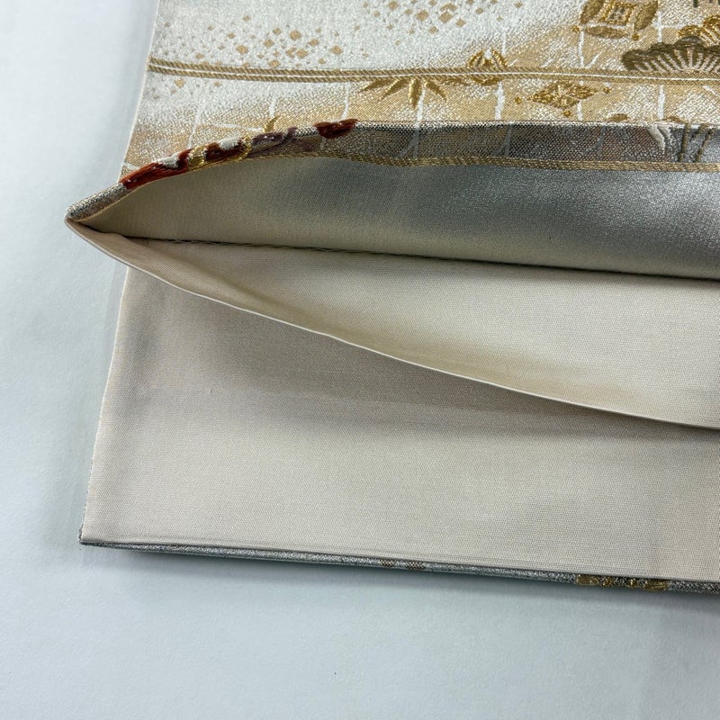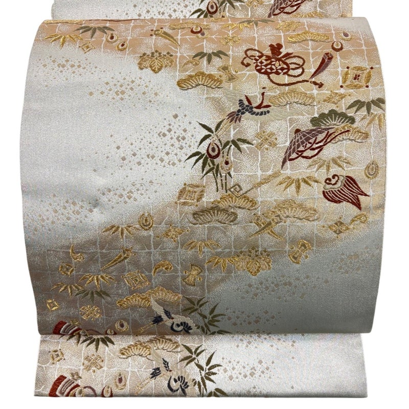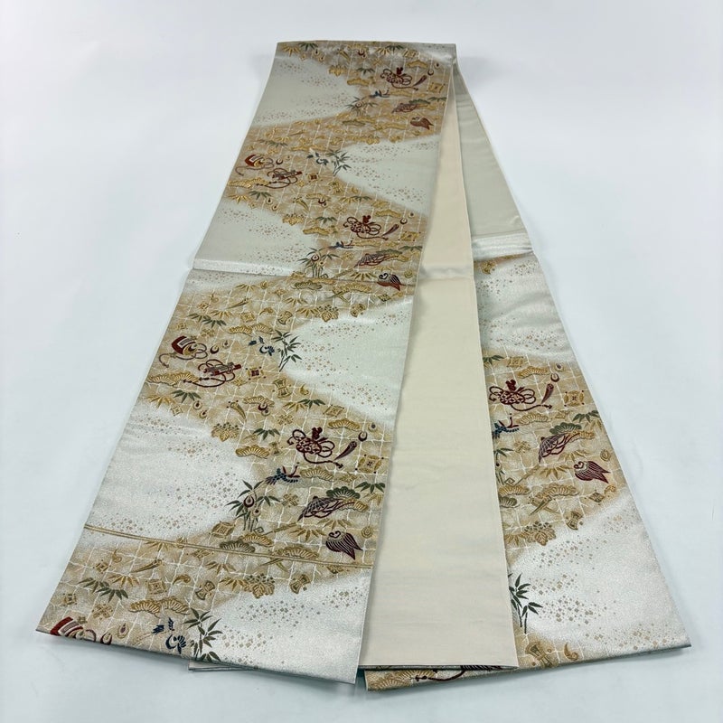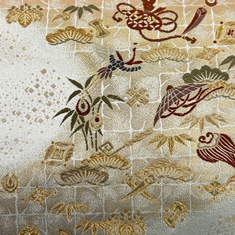 おめでたい席に相応しい意匠の袋帯でございます。 格式高いお席にもお使いいただけますので、お見逃しのないようお願いいたします。 締め跡がございます。 リユース品としては目立った染み傷なく、状態の良いお品でございます。 ※なお、厳しく商品の状態確認を行っておりますが、記載の汚れ以外にも見落とし箇所がある可能性がある旨ご了承いただけますと幸いです。 沢山の商品の中からご覧いただき誠にありがとうございます。