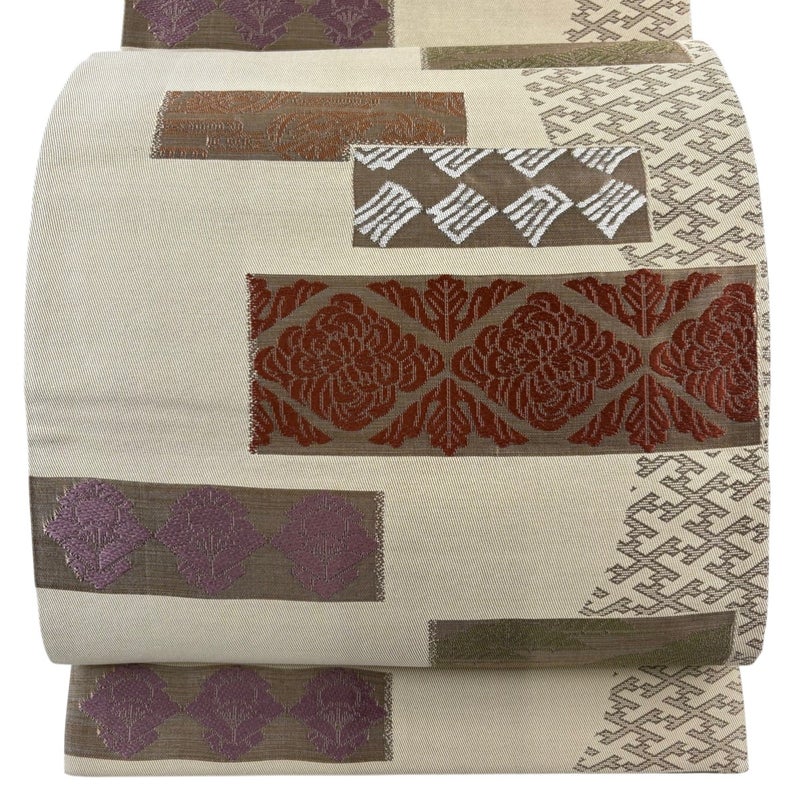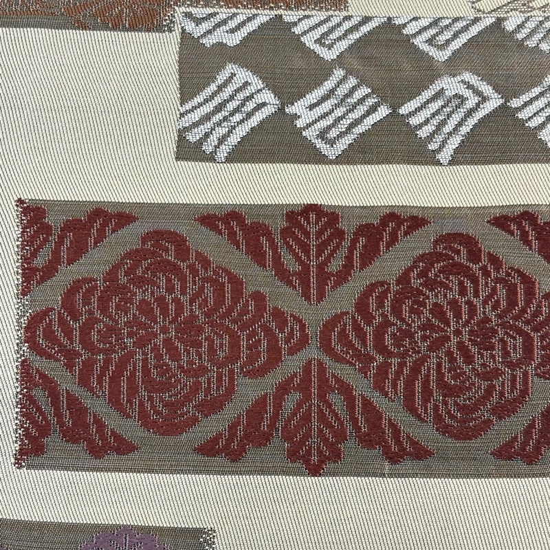 普段使いでお使いいただける袋帯でございます。 カジュアルな装いに合わせてお使いください。 締め跡がございます。 中無地所々とお太鼓垂先間に小さなシミがございます。 リユース品としては目立った染み傷なく、状態の良いお品でございます。 ※なお、厳しく商品の状態確認を行っておりますが、記載の汚れ以外にも見落とし箇所がある可能性がある旨ご了承いただけますと幸いです。 沢山の商品の中からご覧いただき誠にありがとうございます。 【PR2】