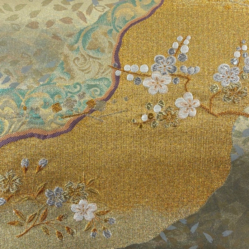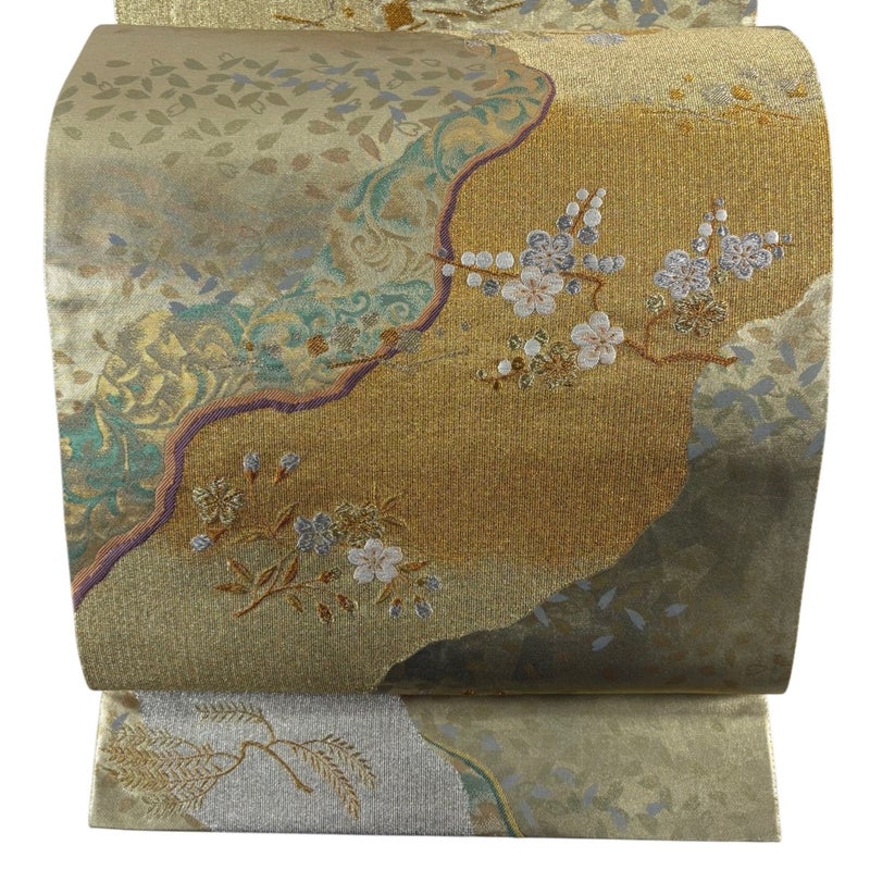 セミフォーマルでお使いいただける袋帯でございます。 見る人に重たい印象を感じさせない女性ならではの、気品豊かな一品です。 締め跡がございます。 お太鼓付近に薄いシワがございます。 リユース品としては目立った染み傷なく、状態の良いお品でございます。 ※なお、厳しく商品の状態確認を行っておりますが、記載の汚れ以外にも見落とし箇所がある可能性がある旨ご了承いただけますと幸いです。 沢山の商品の中からご覧いただき誠にありがとうございます。 【PR2】
