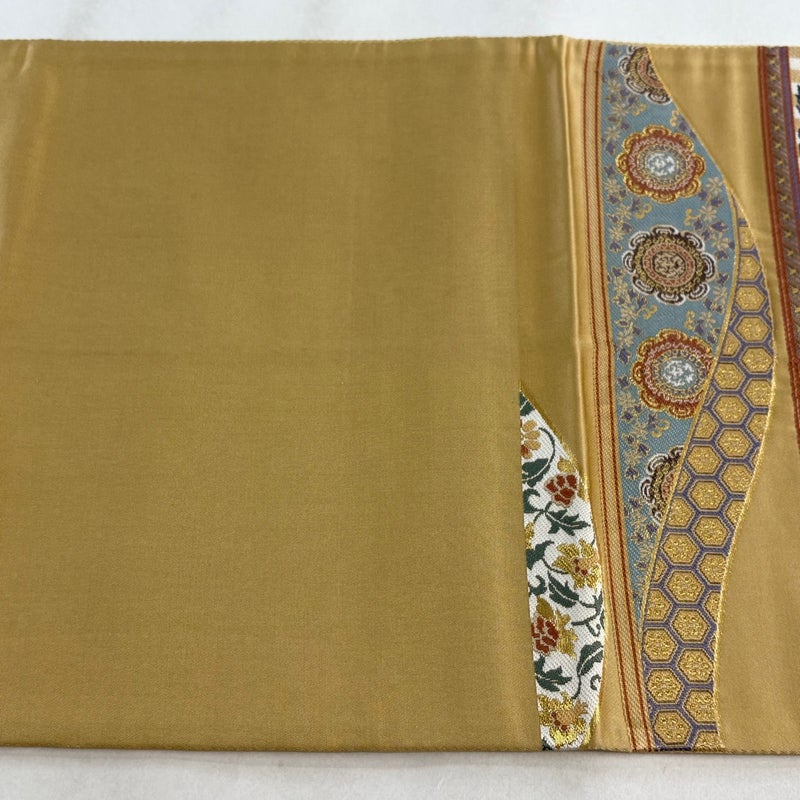 セミフォーマルでお使いいただける袋帯でございます。 見る人に重たい印象を感じさせない女性ならではの、気品豊かな一品です。 締め跡がございます。 締め跡沿いに薄汚れ、帯縁所々に若干の柄の毛羽立ちがございます。 リユース品としては良い状態で、まだまだご活用頂けると思われます。 ※なお、厳しく商品の状態確認を行っておりますが、記載の汚れ以外にも見落とし箇所がある可能性がある旨ご了承いただけますと幸いです。 沢山の商品の中からご覧いただき誠にありがとうございます。