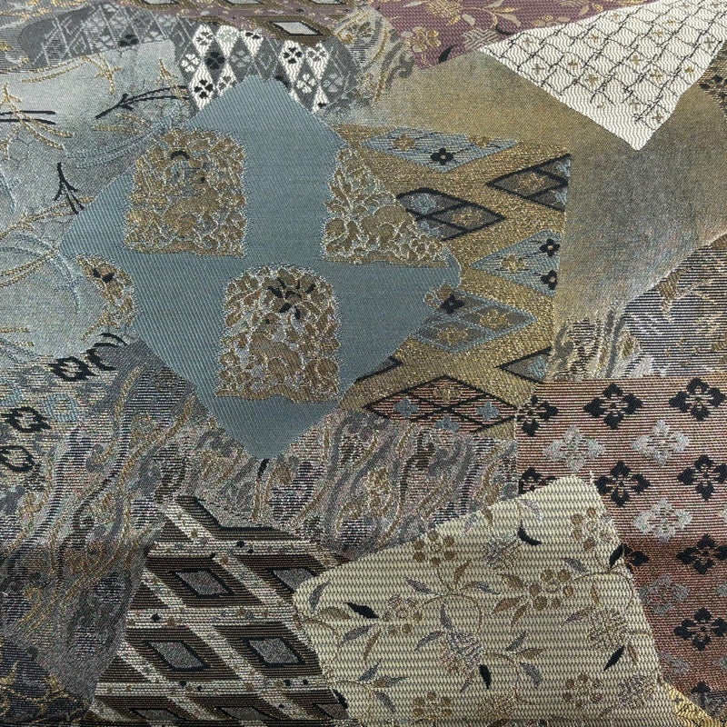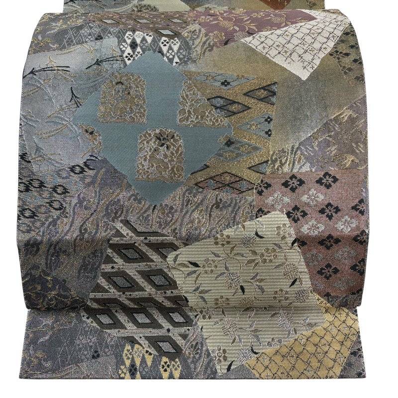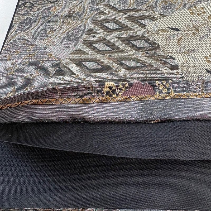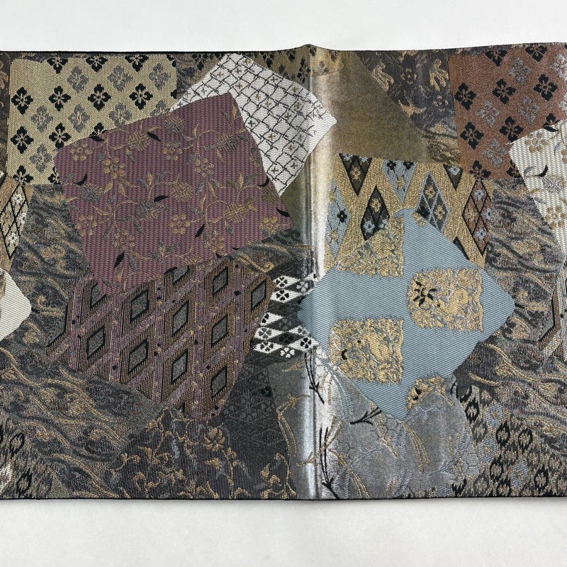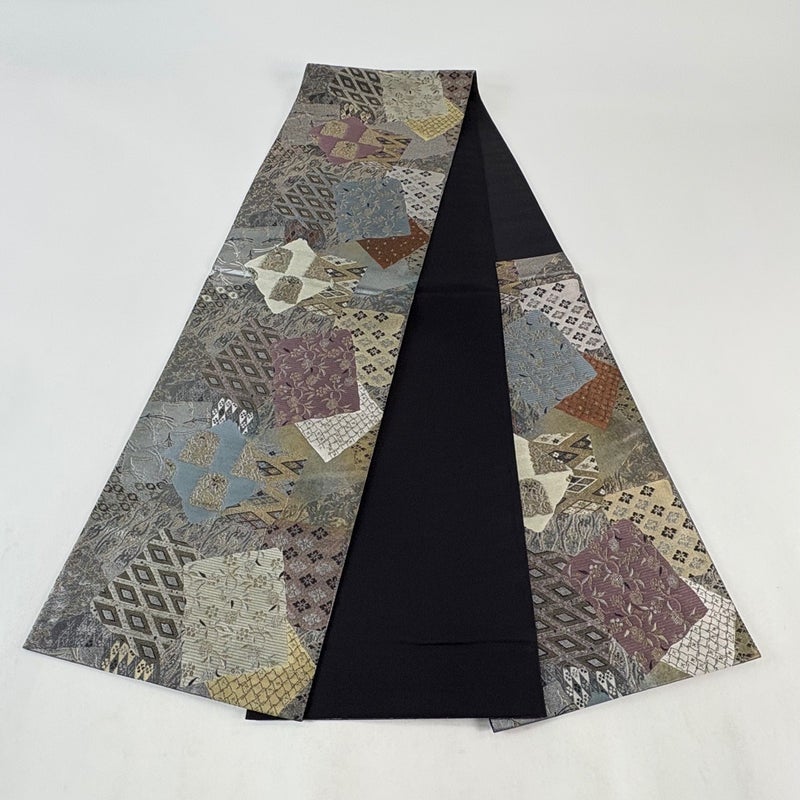 【美品】 袋帯 秀品 色紙 寄せ柄 金糸 箔 灰色 六通 正絹