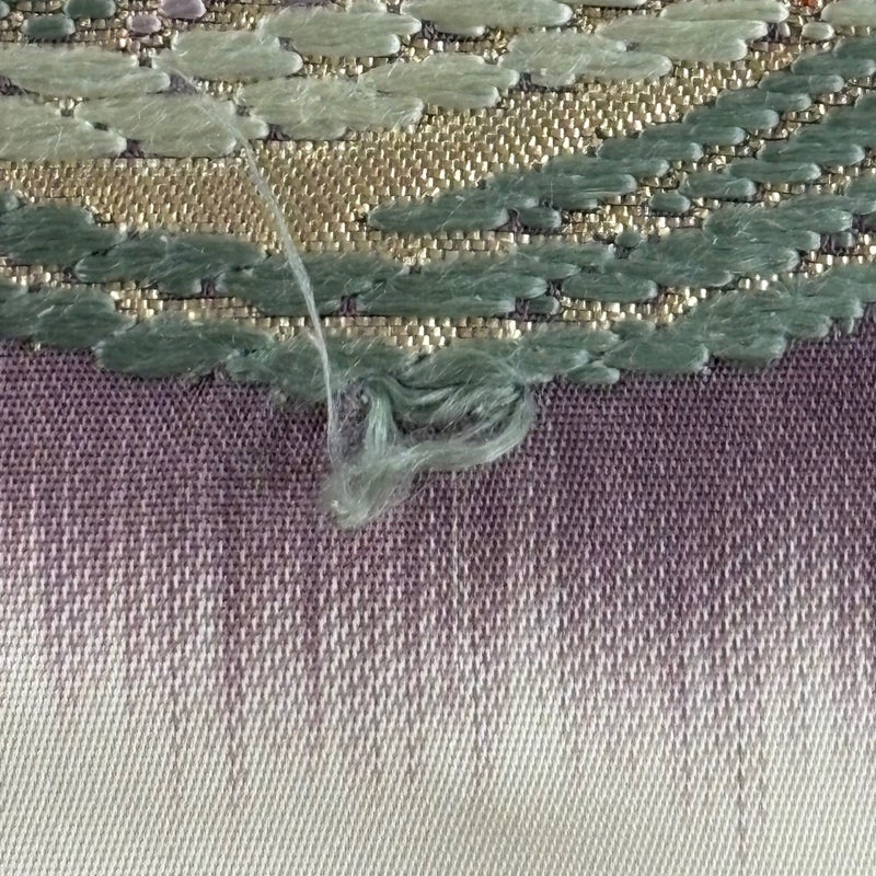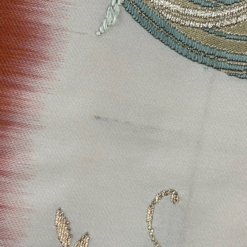 セミフォーマルでお使いいただける袋帯でございます。 見る人に重たい印象を感じさせない女性ならではの、気品豊かな一品です。 締め跡がございます。 締め跡沿いと前柄に汚れ、手先に薄いシミ、お太鼓垂先間に柄のほつれ、表地所々に糸ゆるみがございます。 ご購入の際はその点ご留意ください。 ※なお、厳しく商品の状態確認を行っておりますが、記載の汚れ以外にも見落とし箇所がある可能性がある旨ご了承いただけますと幸いです。 沢山の商品の中からご覧いただき誠にありがとうございます。