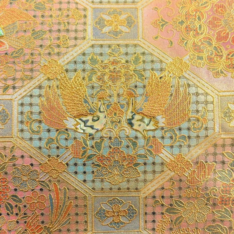 おめでたい席に相応しい意匠の袋帯でございます。 格式高いお席にもお使いいただけますので、お見逃しのないようお願いいたします。 締め跡がございます。 手先前柄間に線シミ、お太鼓柄部分に小さな螺鈿の剥がれ、お太鼓所々と前柄所々に金彩の剥がれがございます。 裏地所々に線シミがございます。 リユース品としては良い状態で、まだまだご活用頂けると思われます。 ※なお、厳しく商品の状態確認を行っておりますが、記載の汚れ以外にも見落とし箇所がある可能性がある旨ご了承いただけますと幸いです。 沢山の商品の中からご覧いただき誠にありがとうございます。