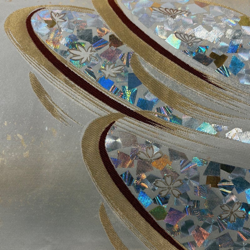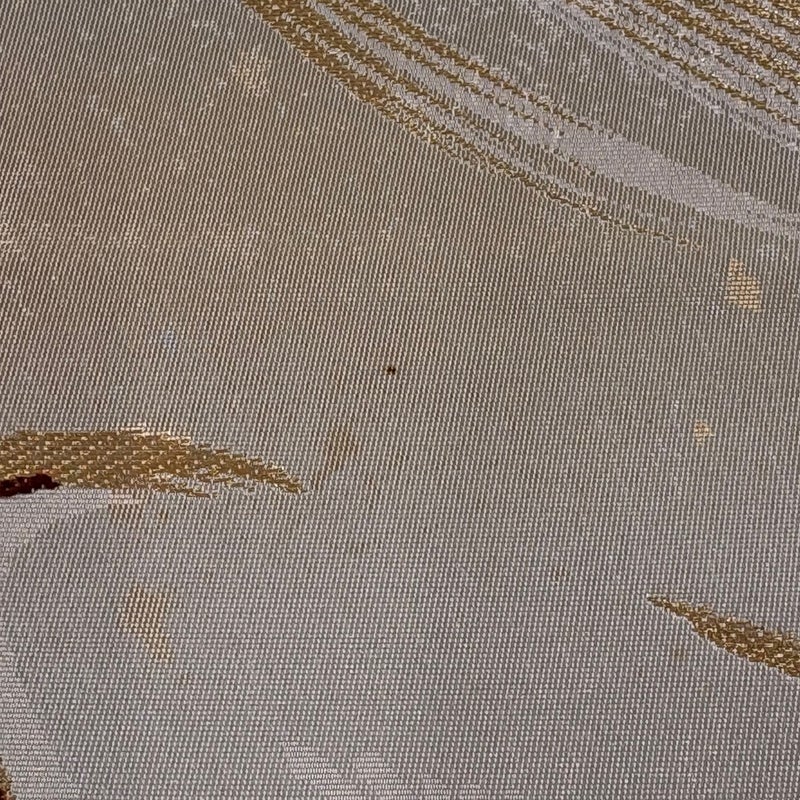角度によって巧みに表情を変え反射する箔加工を得意とする堀省平の作品でございます。 おめでたい席に相応しい意匠の袋帯でございます。 格式高いお席にもお使いいただけますので、お見逃しのないようお願いいたします。 締め跡がございます。 前柄付近と手先前柄間所々にシミ、締め跡沿いに薄汚れ、締め跡沿いと垂先付近にシワ、締め跡沿いに箔の傷みがございます。 裏地所々に薄いシミがございます。 リユース品としては良い状態で、まだまだご活用頂けると思われます。 ※なお、厳しく商品の状態確認を行っておりますが、記載の汚れ以外にも見落とし箇所がある可能性がある旨ご了承いただけますと幸いです。 沢山の商品の中からご覧いただき誠にありがとうございます。