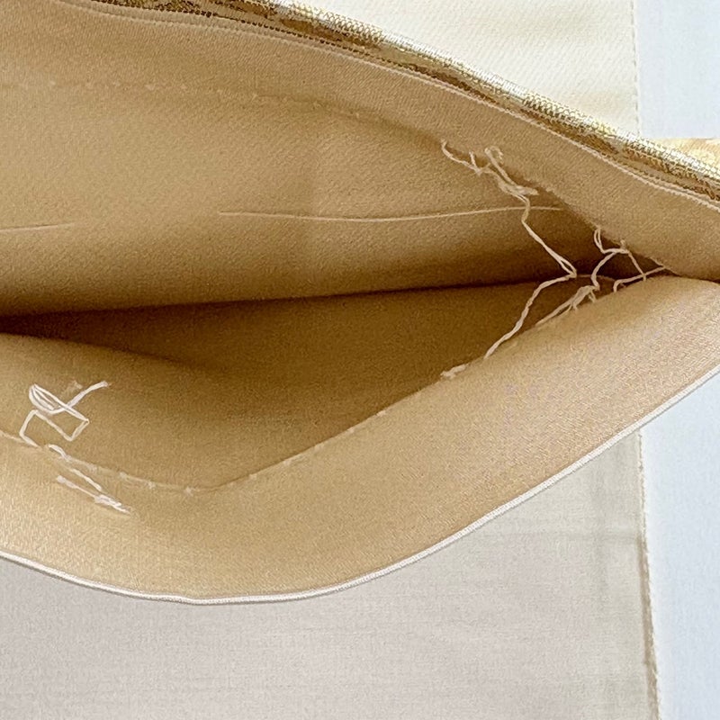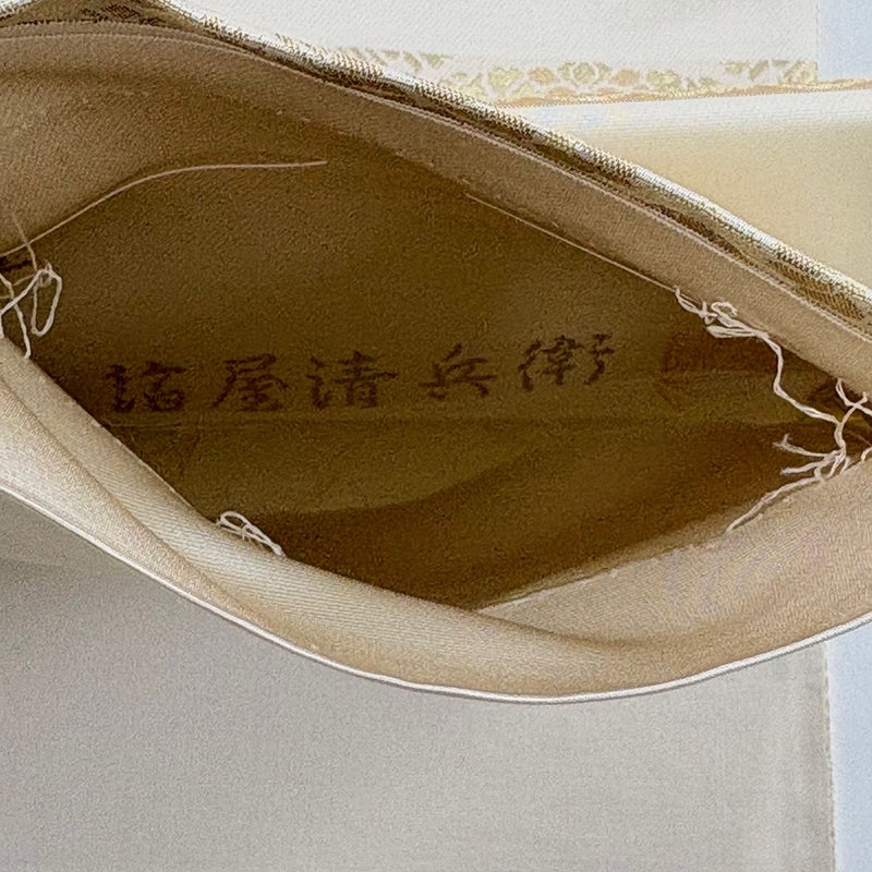 西陣の陰山織物謹製のブランド「箔屋清兵衛」の帯です。 セミフォーマルでお使いいただける袋帯でございます。 見る人に重たい印象を感じさせない女性ならではの、気品豊かな一品です。 締め跡がございます。 締め跡沿いに汚れ、締め跡沿いにシワ、表地所々に箔の変色、手先前柄間に色移りがございます。 裏地所々にシワがございます。 リユース品としては良い状態で、まだまだご活用頂けると思われます。 ※なお、厳しく商品の状態確認を行っておりますが、記載の汚れ以外にも見落とし箇所がある可能性がある旨ご了承いただけますと幸いです。 沢山の商品の中からご覧いただき誠にありがとうございます。 ※垂先が開いております。予めご了承くださいませ。