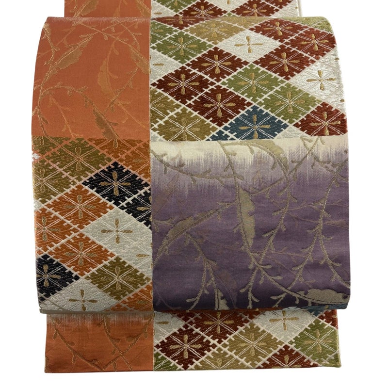 セミフォーマルでお使いいただける袋帯でございます。 見る人に重たい印象を感じさせない女性ならではの、気品豊かな一品です。 裏地所々に点シミがございます。 リユース品としては目立った染み傷なく、状態の良いお品でございます。 ※なお、厳しく商品の状態確認を行っておりますが、記載の汚れ以外にも見落とし箇所がある可能性がある旨ご了承いただけますと幸いです。 沢山の商品の中からご覧いただき誠にありがとうございます。
