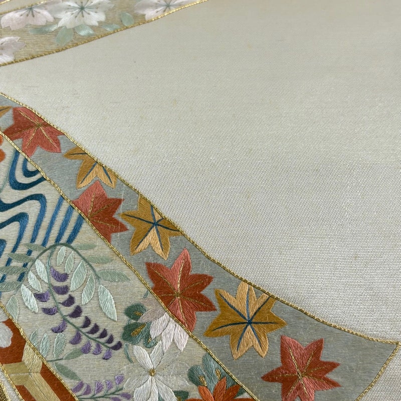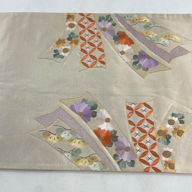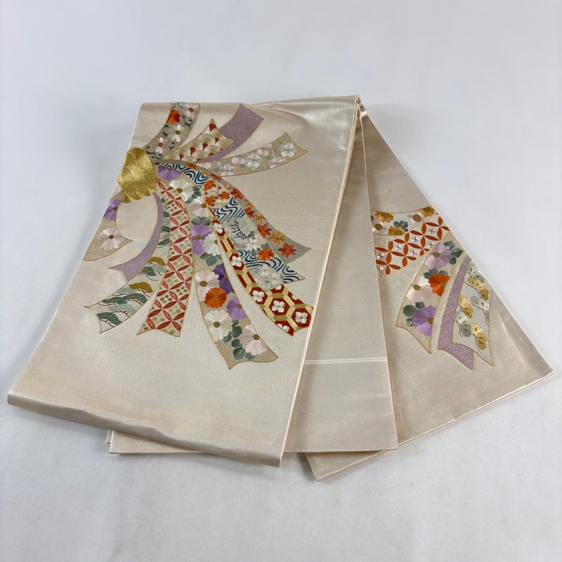 セミフォーマルでお使いいただける袋帯でございます。 見る人に重たい印象を感じさせない女性ならではの、気品豊かな一品です。 締め跡がございます。 お太鼓所々と前柄所々など表地所々にシミ、お太鼓垂先間に薄いシミ、手先前柄間に線シミ、前柄お太鼓間にシワがございます。 裏地所々にシミがございます。 ご購入の際はその点ご留意ください。 ※なお、厳しく商品の状態確認を行っておりますが、記載の汚れ以外にも見落とし箇所がある可能性がある旨ご了承いただけますと幸いです。 沢山の商品の中からご覧いただき誠にありがとうございます。 【PR2】