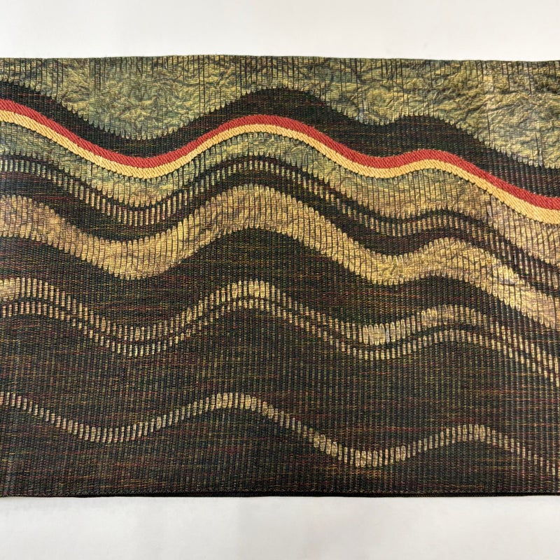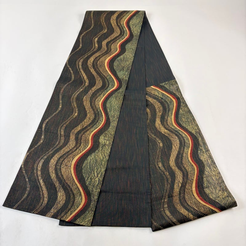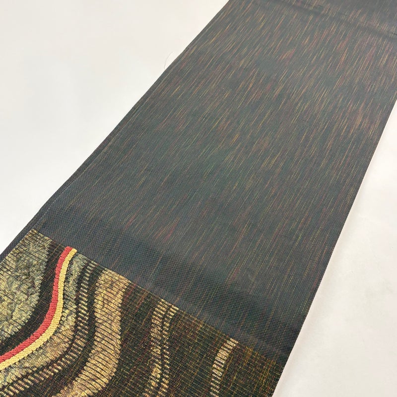 【美品】 袋帯 秀品 よろけ縞 金糸 金彩 黒 六通 正絹