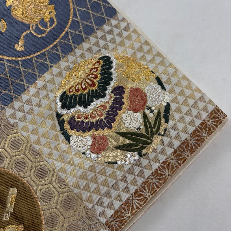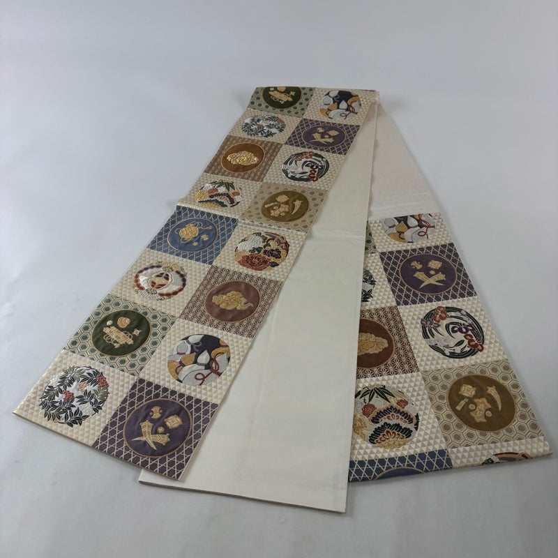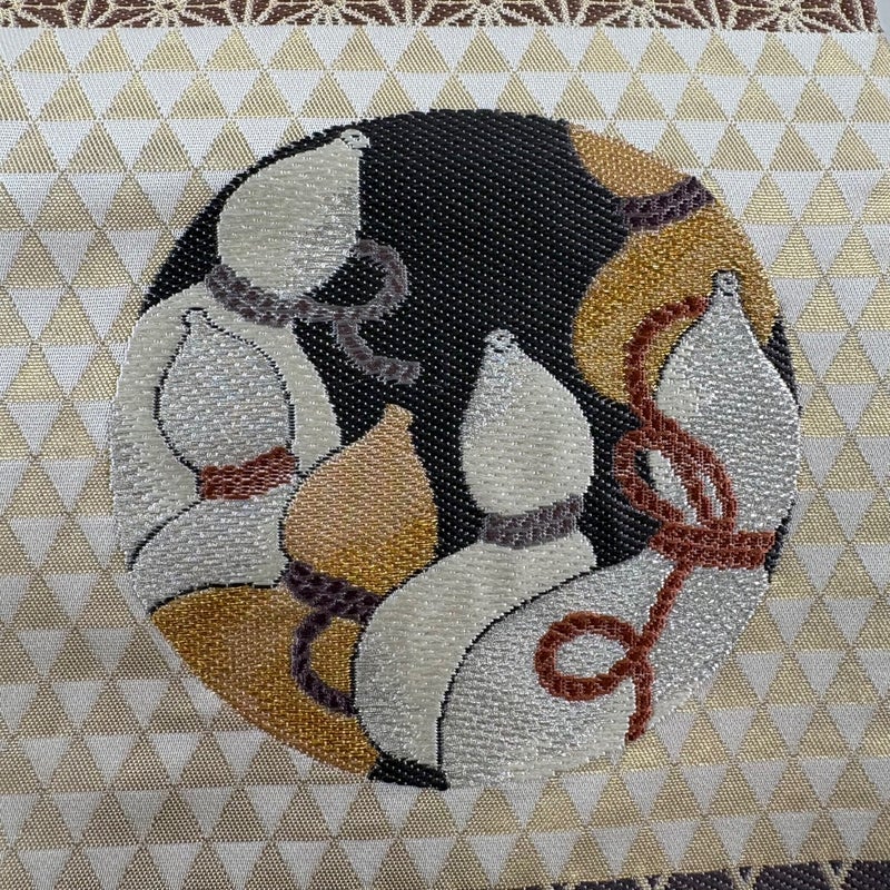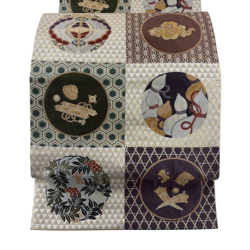 おめでたい席に相応しい意匠の袋帯でございます。 格式高いお席にもお使いいただけますので、お見逃しのないようお願いいたします。 締め跡がございます。 中無地締め跡沿いに薄汚れ、手先所々に箔の変色がございます。 リユース品としては良い状態で、まだまだご活用頂けると思われます。 ※なお、厳しく商品の状態確認を行っておりますが、記載の汚れ以外にも見落とし箇所がある可能性がある旨ご了承いただけますと幸いです。 沢山の商品の中からご覧いただき誠にありがとうございます。