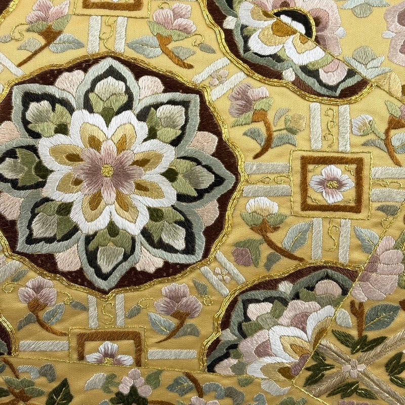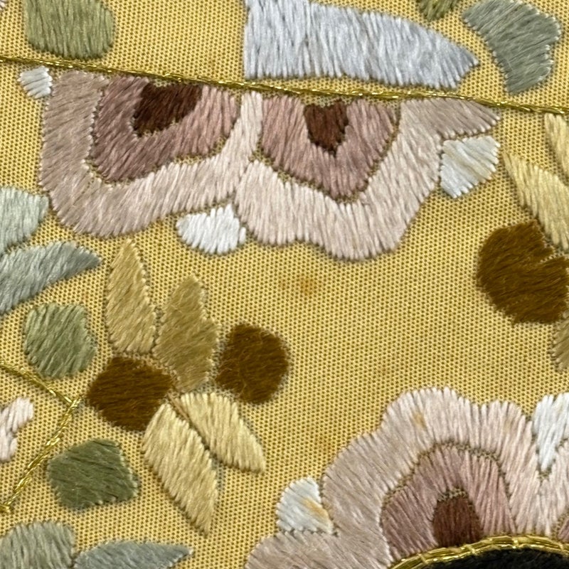 セミフォーマルでお使いいただける袋帯でございます。 見る人に重たい印象を感じさせない女性ならではの、気品豊かな一品です。 締め跡がございます。 お太鼓垂先間と前柄お太鼓間など所々に小さなシミ、お太鼓柄付近など所々に薄いシミ、中無地に線シミ、前柄付近などに刺繍糸のほつれがございます。 リユース品としては良い状態で、まだまだご活用頂けると思われます。 ※なお、厳しく商品の状態確認を行っておりますが、記載の汚れ以外にも見落とし箇所がある可能性がある旨ご了承いただけますと幸いです。 沢山の商品の中からご覧いただき誠にありがとうございます。