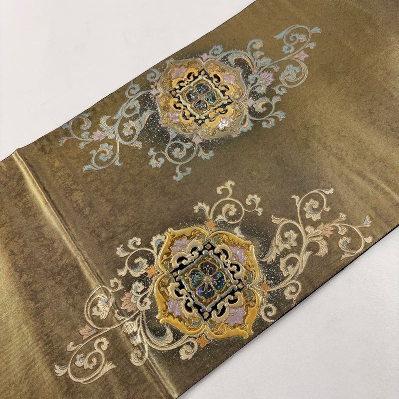 セミフォーマルでお使いいただける袋帯でございます。 見る人に重たい印象を感じさせない女性ならではの、気品豊かな一品です。 締め跡がございます。 ※締め跡がお太鼓を含む帯全体にございます。 手先前柄間など表地所々に締め跡による汚れ、手先前柄間に薄汚れ、表地所々に金彩の変色がございます。 リユース品としては良い状態で、まだまだご活用頂けると思われます。 ※なお、厳しく商品の状態確認を行っておりますが、記載の汚れ以外にも見落とし箇所がある可能性がある旨ご了承いただけますと幸いです。 沢山の商品の中からご覧いただき誠にありがとうございます。