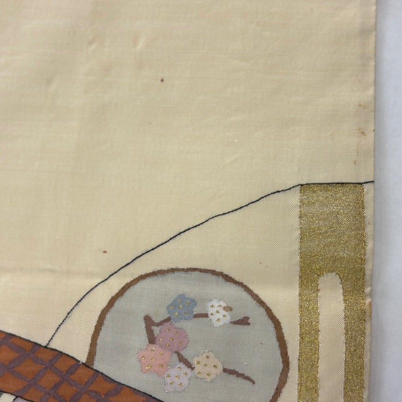 セミフォーマルでお使いいただける袋帯でございます。 見る人に重たい印象を感じさせない女性ならではの、気品豊かな一品です。 締め跡がございます。 表地所々とお太鼓付近と前柄付近にシミ、表地所々に薄汚れ、お太鼓垂先間にシワがございます。 裏地所々にシミがございます。 リユース品としては良い状態で、まだまだご活用頂けると思われます。 ※なお、厳しく商品の状態確認を行っておりますが、記載の汚れ以外にも見落とし箇所がある可能性がある旨ご了承いただけますと幸いです。 沢山の商品の中からご覧いただき誠にありがとうございます。 【PR2】