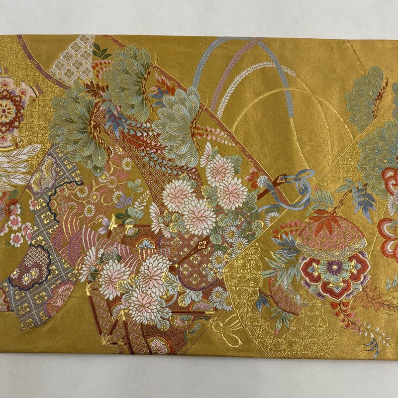 おめでたい席に相応しい意匠の袋帯でございます。 格式高いお席にもお使いいただけますので、お見逃しのないようお願いいたします。 帯芯が入っておりません。 締め跡がございます。 中無地にシワがございます。 リユース品としては目立った染み傷なく、状態の良いお品でございます。 ※なお、厳しく商品の状態確認を行っておりますが、記載の汚れ以外にも見落とし箇所がある可能性がある旨ご了承いただけますと幸いです。 沢山の商品の中からご覧いただき誠にありがとうございます。