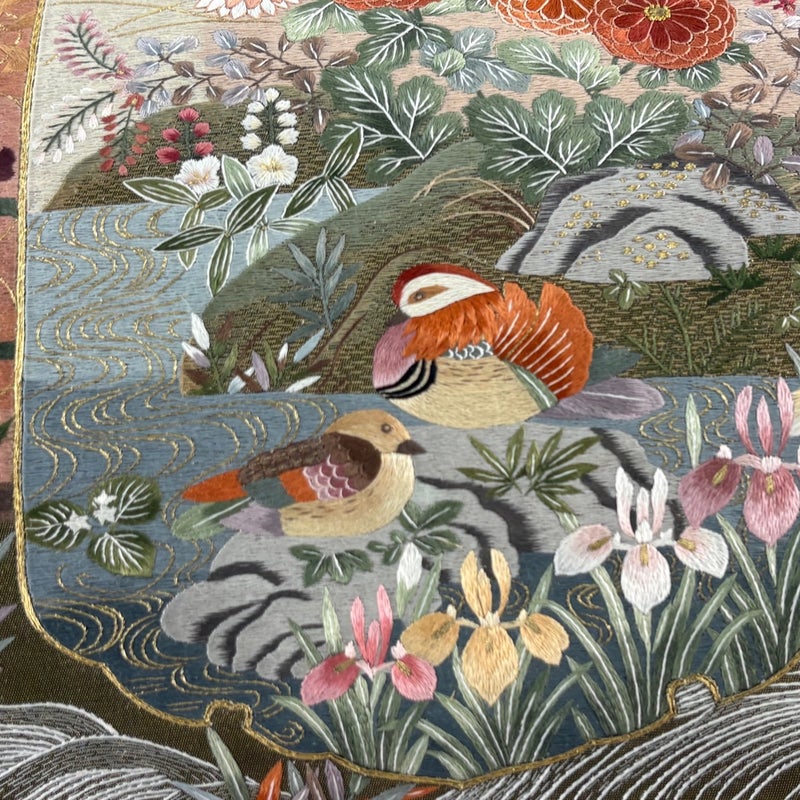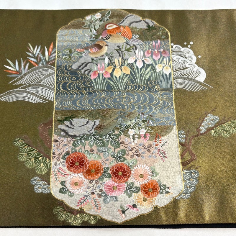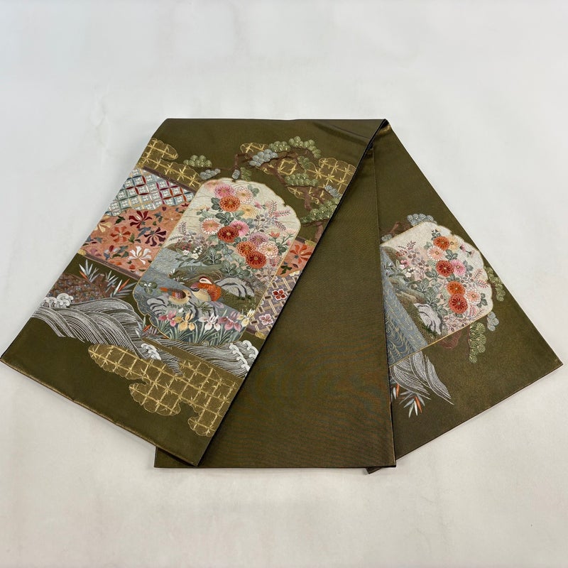 【美品】 袋帯 秀品 鴛鴦 菊 箔 刺繍 金色 お太鼓柄 正絹